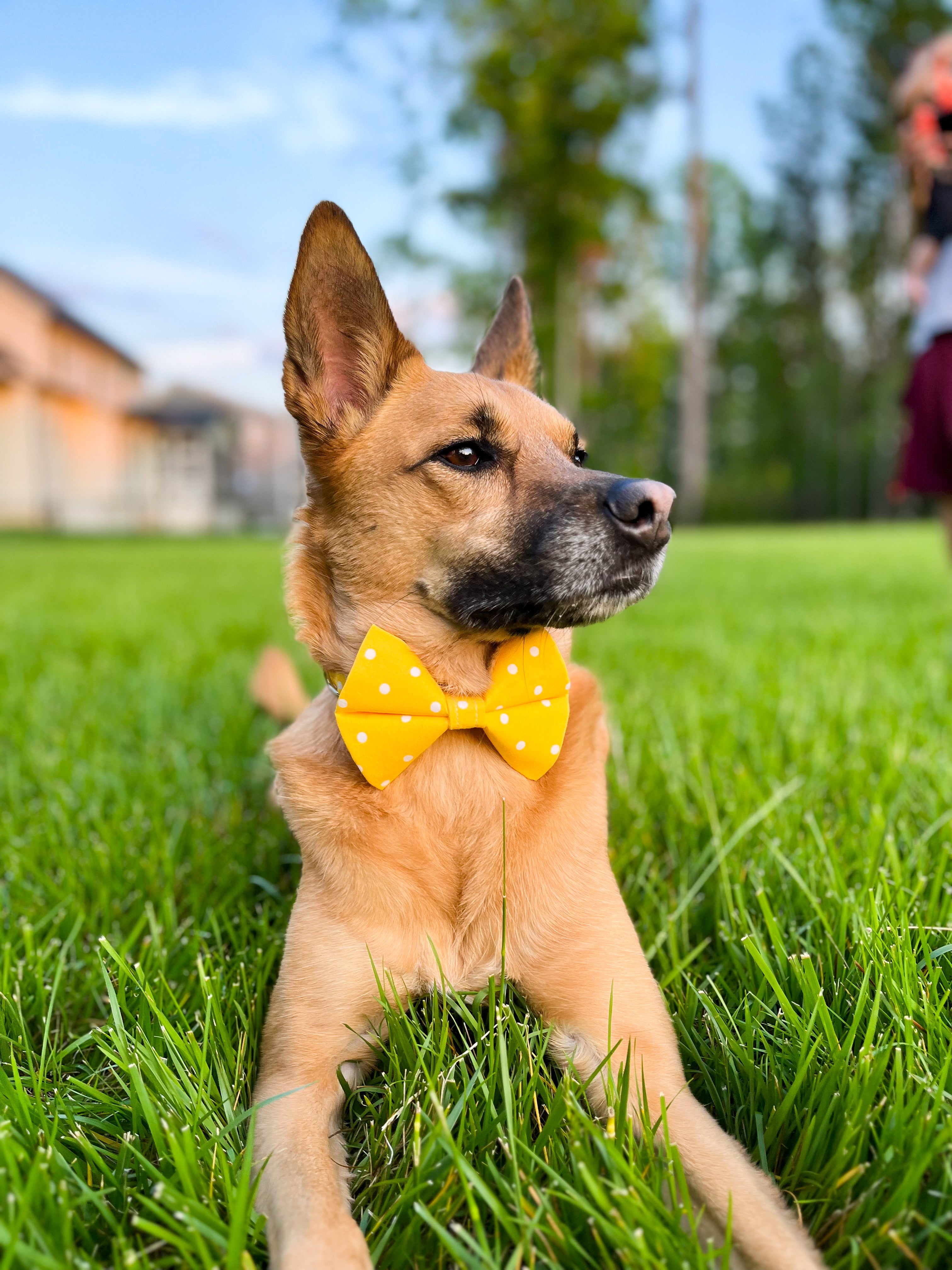 Vibrant Yellow Polka Dot Bow TieEnergetic, Derpy, and friendly. Loves to people watch from her window and bark at the mail man. Always down to eat.