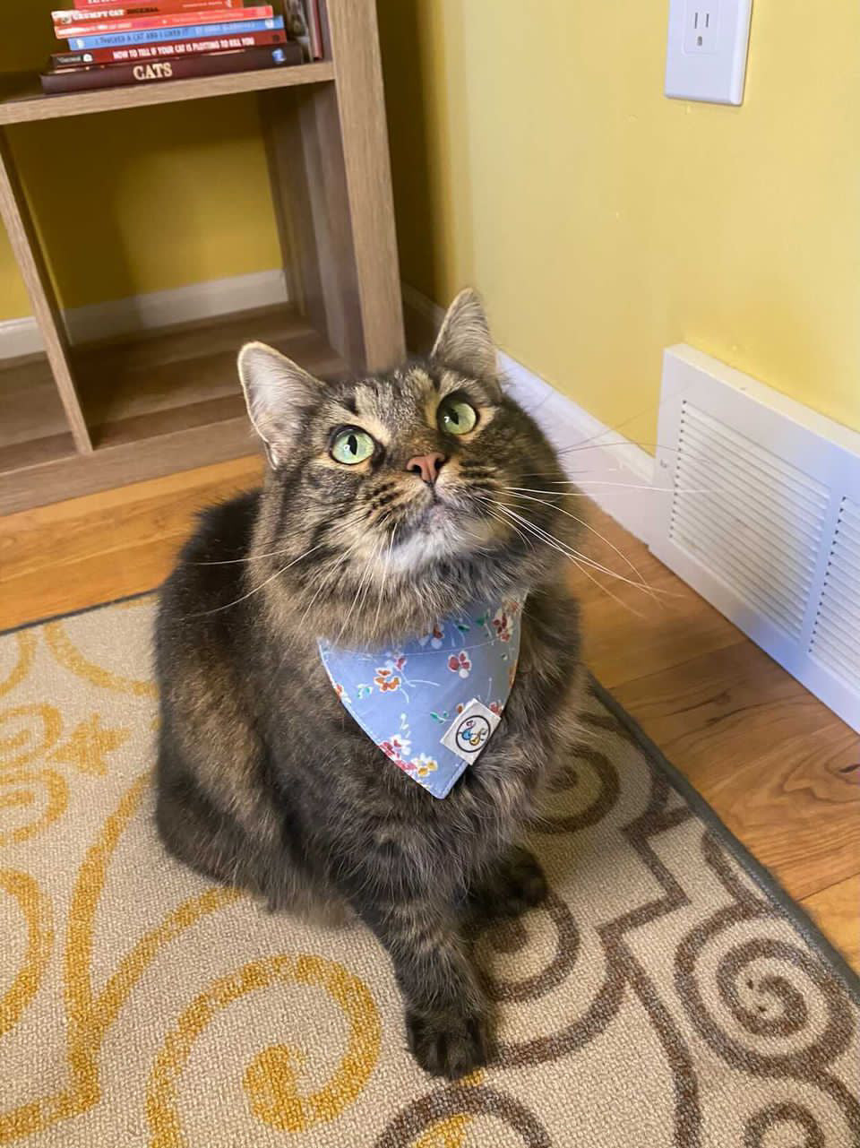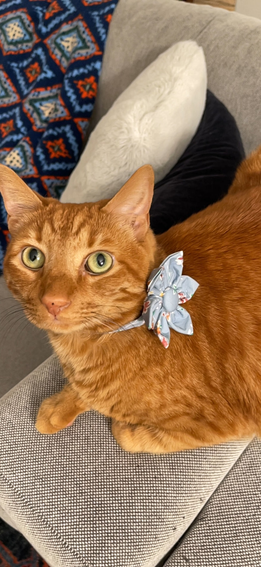 Tangerine and White Floral BandanaCuddly, sweet, and timid. She is truly a lap cat who loves to be anywhere you are. Biological sister to Izzy.