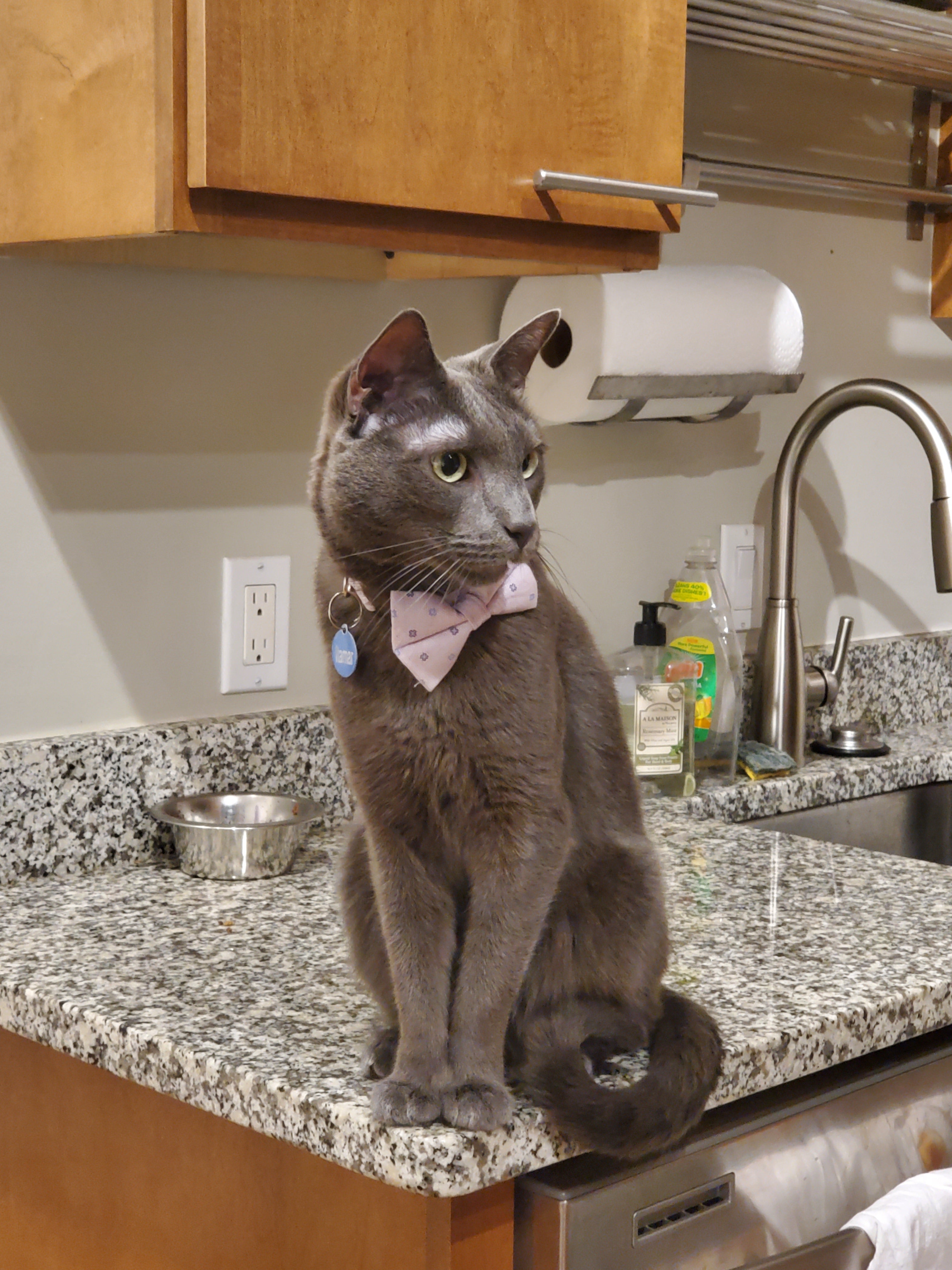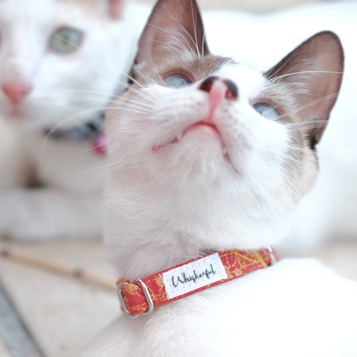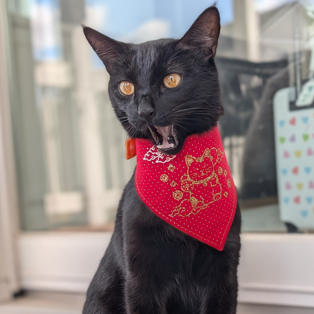 Red and Gold A Blessing, Sewn In™ Reversible Snap-On BandanaDerpy, curious, and affectionate. Loves eating his sister's Izzy's hair ball. Does not take no for an answer.